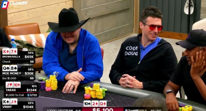 过牌到Vinny,他下注$10,000。错失同花的Brown Balla弃牌。Taras犹豫片刻,决定过牌-加注到$36,000。